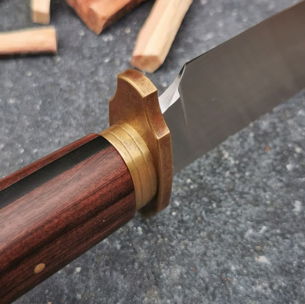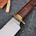Deze mooie handgemaakte Bowie is gemaakt van 80crv2 hoog koolstof staal met een rug dikte van 5mm. De handgreep is gemaakt van Santos rozenhout, met een frame constructie van zwart G10. De stootplaat en spacer zijn gemaakt van messing met een antiek uiterlijk.